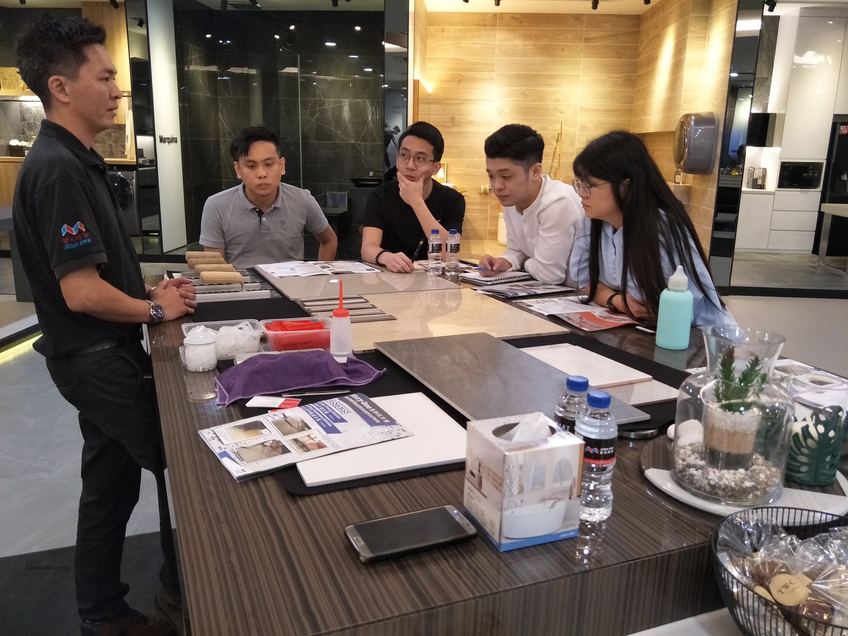 JubinBMS team members sharing the knowledge and experience about tiles with DE SPACE INTERIOR DESIGN members. Thank you for joining us.